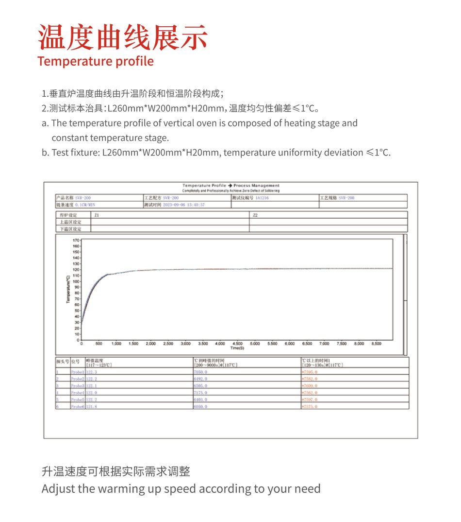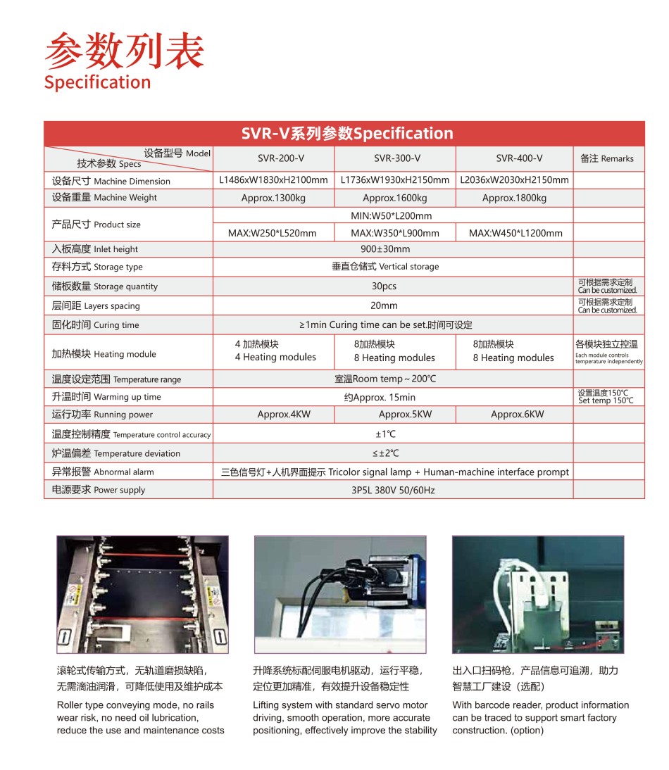 SVR-V系列在線式垂直固化爐,整機(jī)設(shè)計(jì)全新升級(jí),更加人性化。采用分段加熱、獨(dú)立溫控,加熱更高效,控溫更精準(zhǔn)。運(yùn)輸系統(tǒng)穩(wěn)定可靠,操作維護(hù)便捷。全自動(dòng)進(jìn)出產(chǎn)品,智能化生產(chǎn),生產(chǎn)效率高。設(shè)備體積小,有效縮短產(chǎn)線長(zhǎng)度。SVR-V系列垂直固化爐對(duì)于長(zhǎng)板的固化應(yīng)用優(yōu)勢(shì)更加明顯,可容納長(zhǎng)達(dá)1200mm的產(chǎn)品。可定制百級(jí)、千級(jí)、萬(wàn)級(jí)高潔凈度設(shè)備,滿足無(wú)塵生產(chǎn)工藝要求。