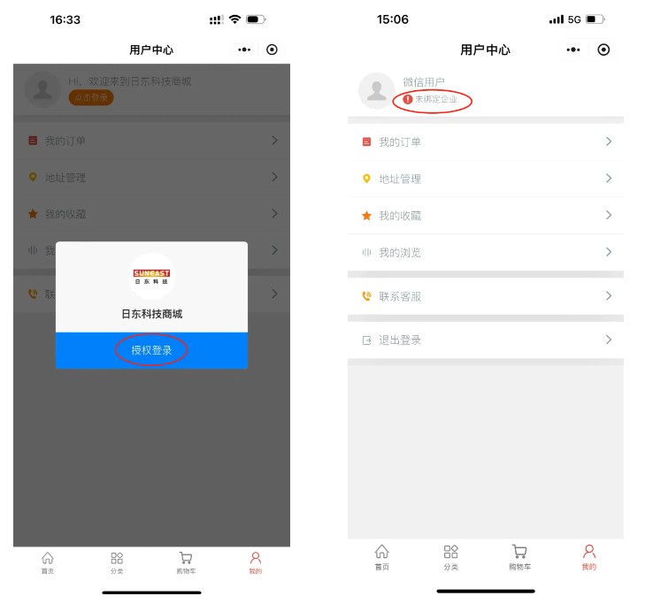進入首頁需先點擊-我的-點擊登錄-授權登錄 –綁定企業,完善企業資料。詳細操作如下圖所示: