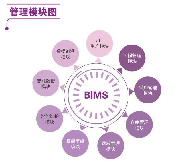 BIMS系統(tǒng)以模塊化的方式提供了一系列獨(dú)特的管理工具及方法,可重構(gòu)生產(chǎn)管理系統(tǒng)或制造執(zhí)行系統(tǒng)。自主研發(fā)的快速重構(gòu)機(jī)制,可根據(jù)客戶業(yè)務(wù)需求,系統(tǒng)各模塊可靈活組裝并深度定制。可快速添加新功能,使BIMS系統(tǒng)更好的延展。從基本功能架構(gòu)上看,BIMS系統(tǒng)的主要功能包括:JIT生產(chǎn)、數(shù)據(jù)追溯。智能防錯(cuò)、智能維護(hù)、智能節(jié)能、遠(yuǎn)端管理、倉(cāng)庫(kù)管理、采購(gòu)管理和工程管理。實(shí)際的客戶系統(tǒng)詳細(xì)功能因需定制,與標(biāo)準(zhǔn)的功能架構(gòu)有所偏差。