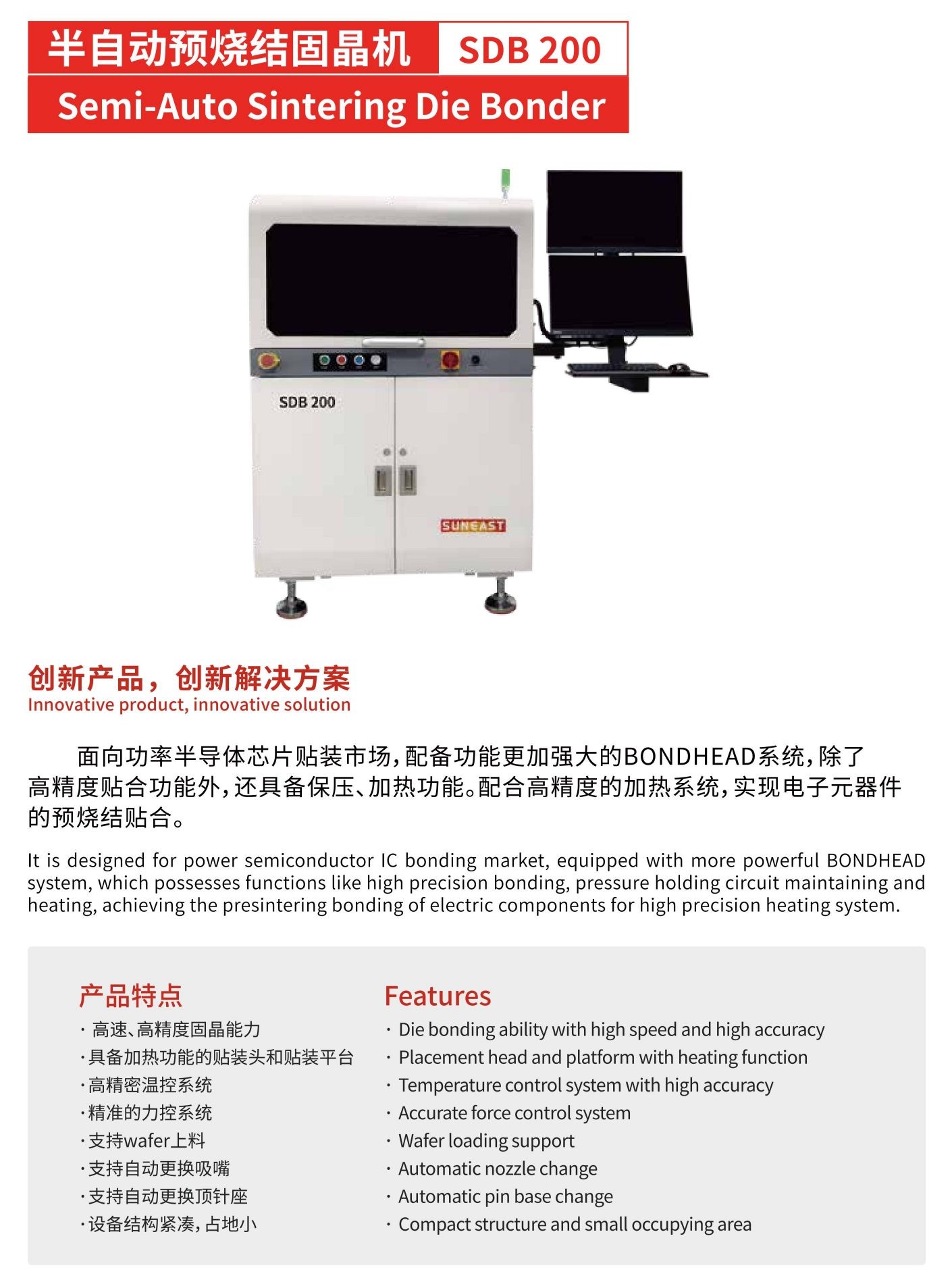 預燒結貼合機面向功率半導體芯片貼裝市場,配備功能更加強大的BONDHEAD系統,除了高精度貼合功能外,還具備保壓、加熱功能。配合高精度的加熱系統,實現電子元器件的預燒結貼合。